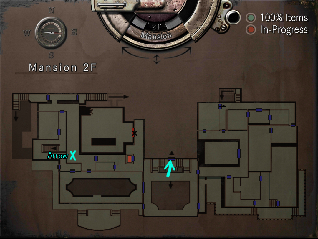 Golden ArrowHead back to where you found Kenneth. If you check him, you'll get a video tape you can watch later in the game. Keep going, and head through the door. Go to the birdcage and get the handgun clip (Easy/Normal mode), and then head by the stairs to find two green herbs. Climb the stairs and enter the door. Have your weapon ready, but don't worry about the zombie in front of you lying down, he won't be back...yet. There will be a green herb by it (2 on Easy). Round the corner and keep going, being sure to watch out for the zombie by the second door. Dodge or kill him, and go down the hall of spears. Pick up the handgun clip in front of the mirror, and the Golden Arrow near it. Examine it and just get the Green Arrowhead. There will be another zombie around the corner (Normal/Hard modes), so watch out for it. Go through the only door you can, the one on the right, once you reach the end of the hall. You'll end up on the dining room balcony, and a zombie will be on the far end of the balcony. Also on the far end of the balcony is a statue holding a Blue Gem. Push it to the open rail and then off the balcony's edge so it breaks on the floor below you. Don't worry about heading back down for it just yet.