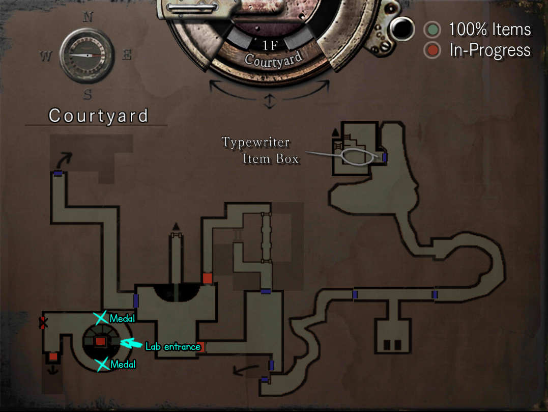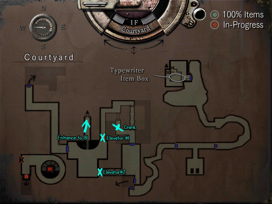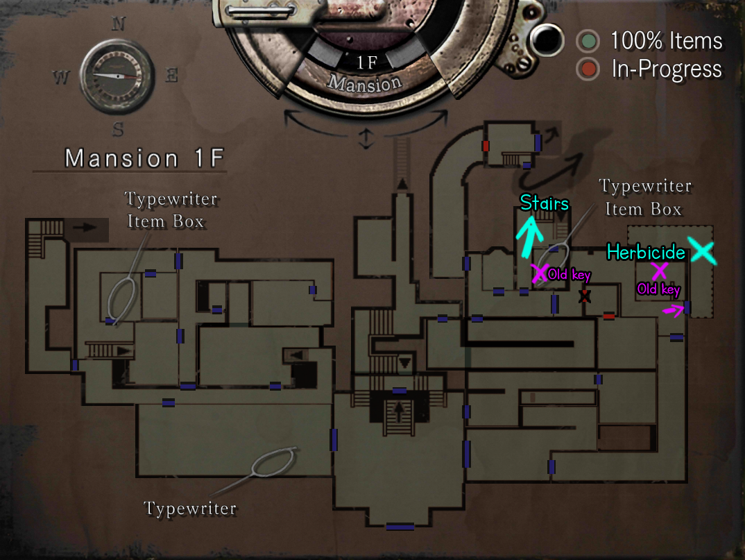 Return to the Main Hall, and take the stairs to the upper west side of this room (above door from the dining room) there are double doors, proceed through them. Avoid the zombie and you need to go into the Sword Key locked door farthest down the right. There are two zombies in the room, one coming up from the stairs and the other around the corner past the stairs. Don't go through the first door you see, although you can unlock it now. You'll notice a zombie on the floor after heading down the stairs, and it'll be back if you don't dispose of it. For now, don't worry about it. Enter the door next to the body and you'll be in a Safe Room. Deposit whatever you don't need, but be sure to keep your handgun and some ammo and the Sword Key. Come back out the Safe Room and go the way you haven't gone yet. There are 2 doors, both locked. You'll need an Old Key to open the door on the right, and the Armor Key to open the one at the end of the hall. Do yourself a favor and unlock the door at the end of the hall on the top of the stairs for a shorter path.